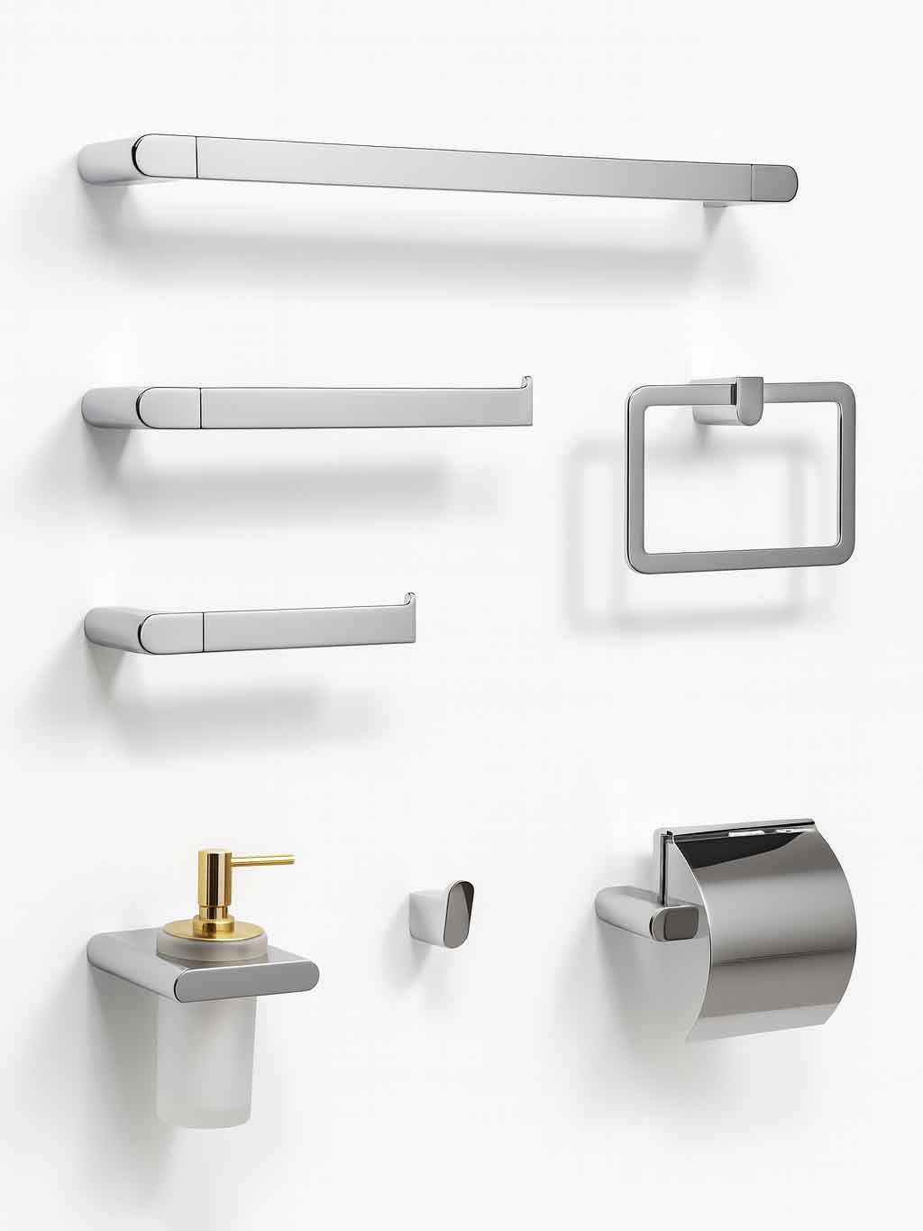 جا حوله, جا حوله کوتاه, جا صابون جامد, جا مایع, جا مسواک, دستمال رول بلند بدون کاور, دستمال کاور دار, دستمال کوتاه بدون کاور, قلاب تک شاخه
