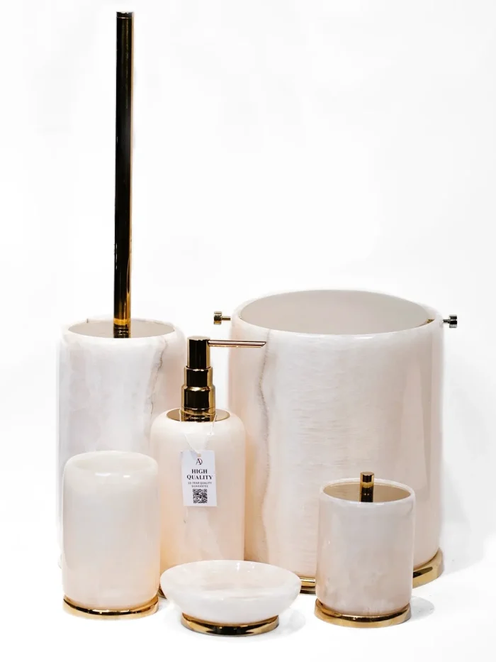 ست سرویس بهداشتی سنگی مرمر صورتی 2025، ترکیبی از زیبایی طبیعی سنگ و کیفیت یراقآلات برنجی است که جلوهای لاکچری و متمایز به فضای شما میدهد.