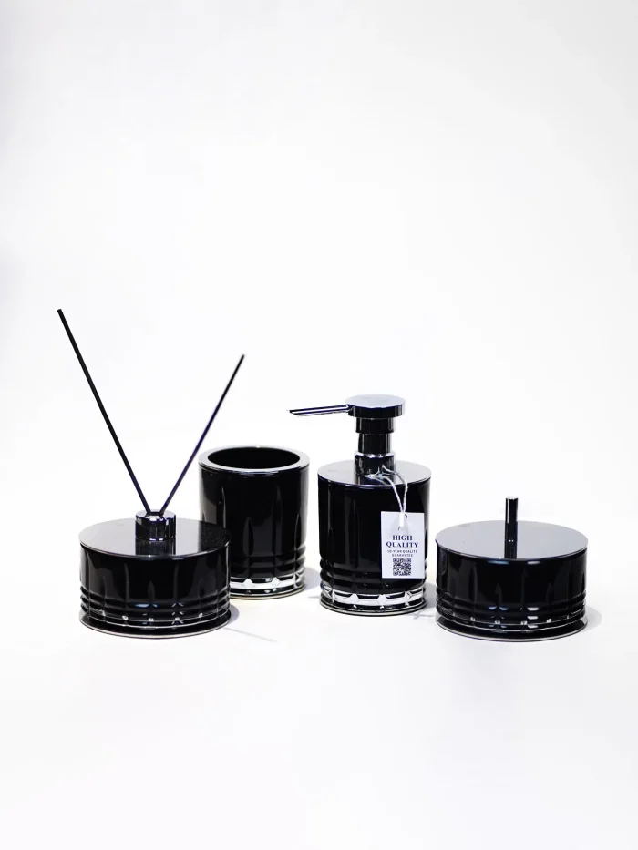 با ست لوکس کریستالی ایتالیک دیزاین مشکی برند اکسو ترکیه، فضای حمام خود را به سطحی از ظرافت و لاکچری ارتقا دهید. این مجموعه شامل ۴ قطعه کاربردی و زیباست: