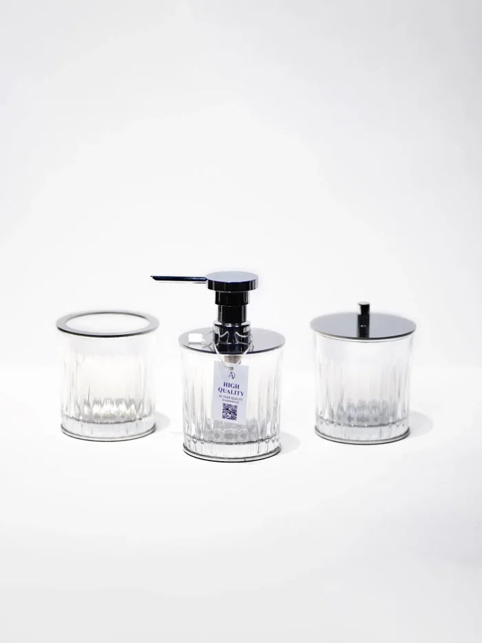 با ست لوکس کریستالی راه راه کروم، فضای حمام خود را به سطحی از ظرافت و لاکچری ارتقا دهید. این مجموعه شامل 3 قطعه کاربردی و زیباست: