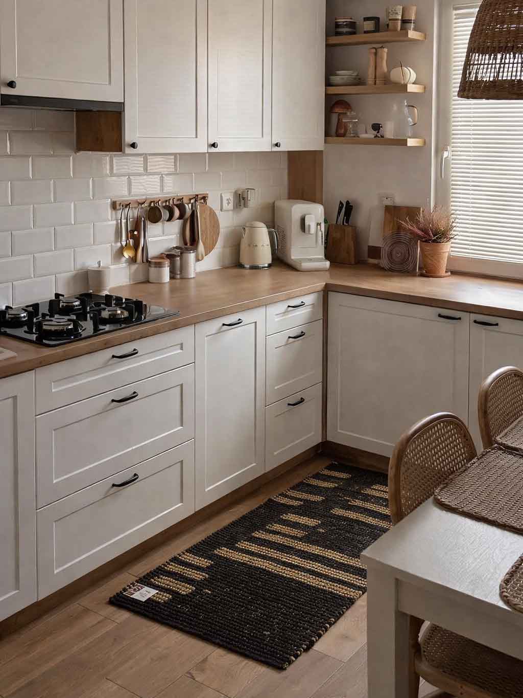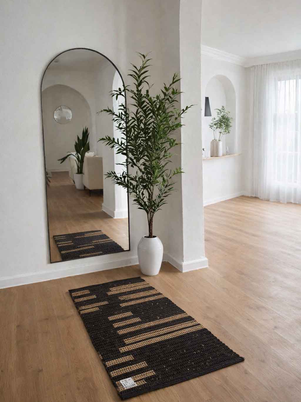 گلیم جوت مشکی طرح مدرن با رنگ خاص و طرح کنترل شده، هم حس طبیعی جوت را وارد خانه می کند و هم یک ظاهر امروزی و مرتب به فضا می دهد.