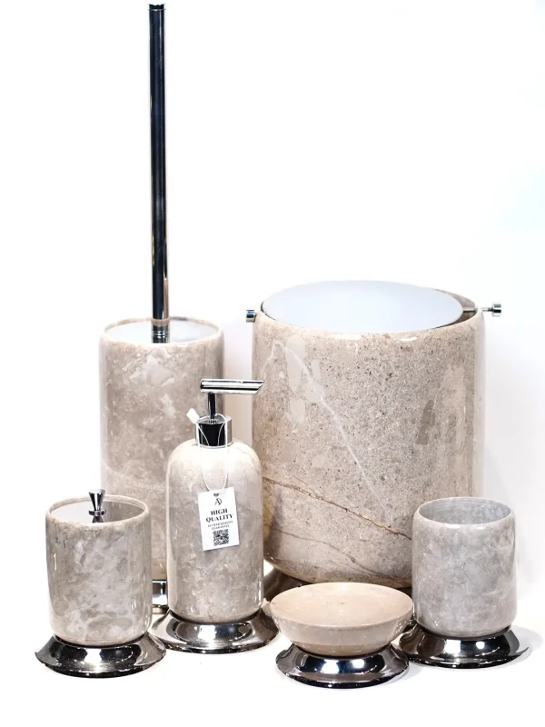 ست سرویس بهداشتی سنگی تراورتن طوسی روشن 1919 انتخابی لوکس و منحصربهفرد برای فضاهای حمام و سرویس بهداشتی است.