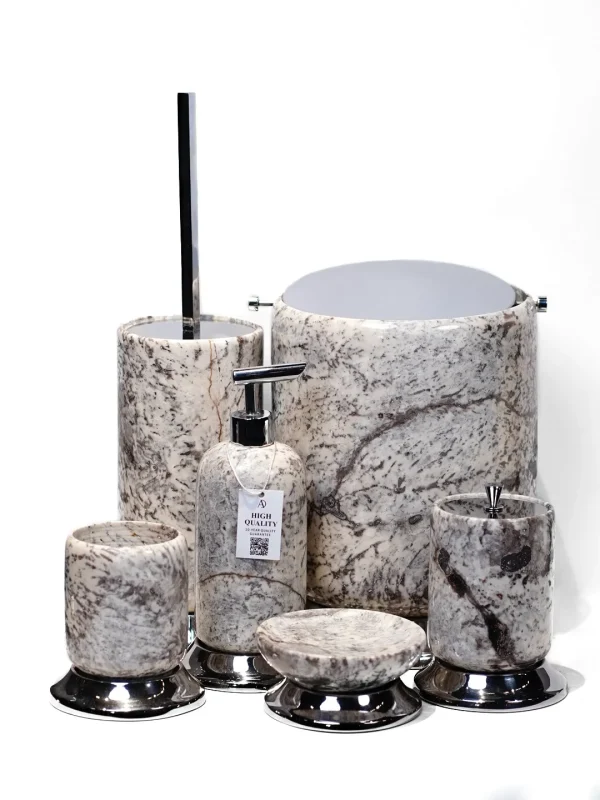 ست سرویس بهداشتی سنگی تراورتن نقرهای 1919 انتخابی لوکس و منحصربهفرد برای فضاهای حمام و سرویس بهداشتی است.