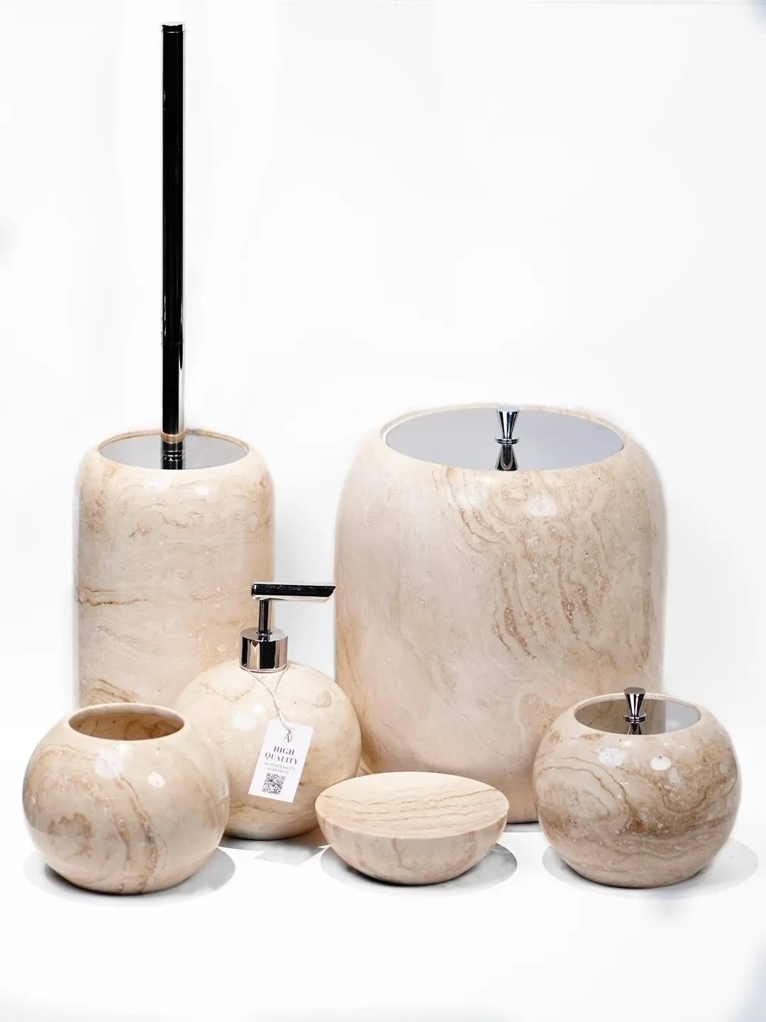 ست سرویس بهداشتی سنگی تراورتن کرم 1500، ترکیبی از زیبایی طبیعی سنگ و کیفیت یراق‌آلات برنجی است که جلوه‌ای لاکچری و متمایز به فضای شما می‌دهد.